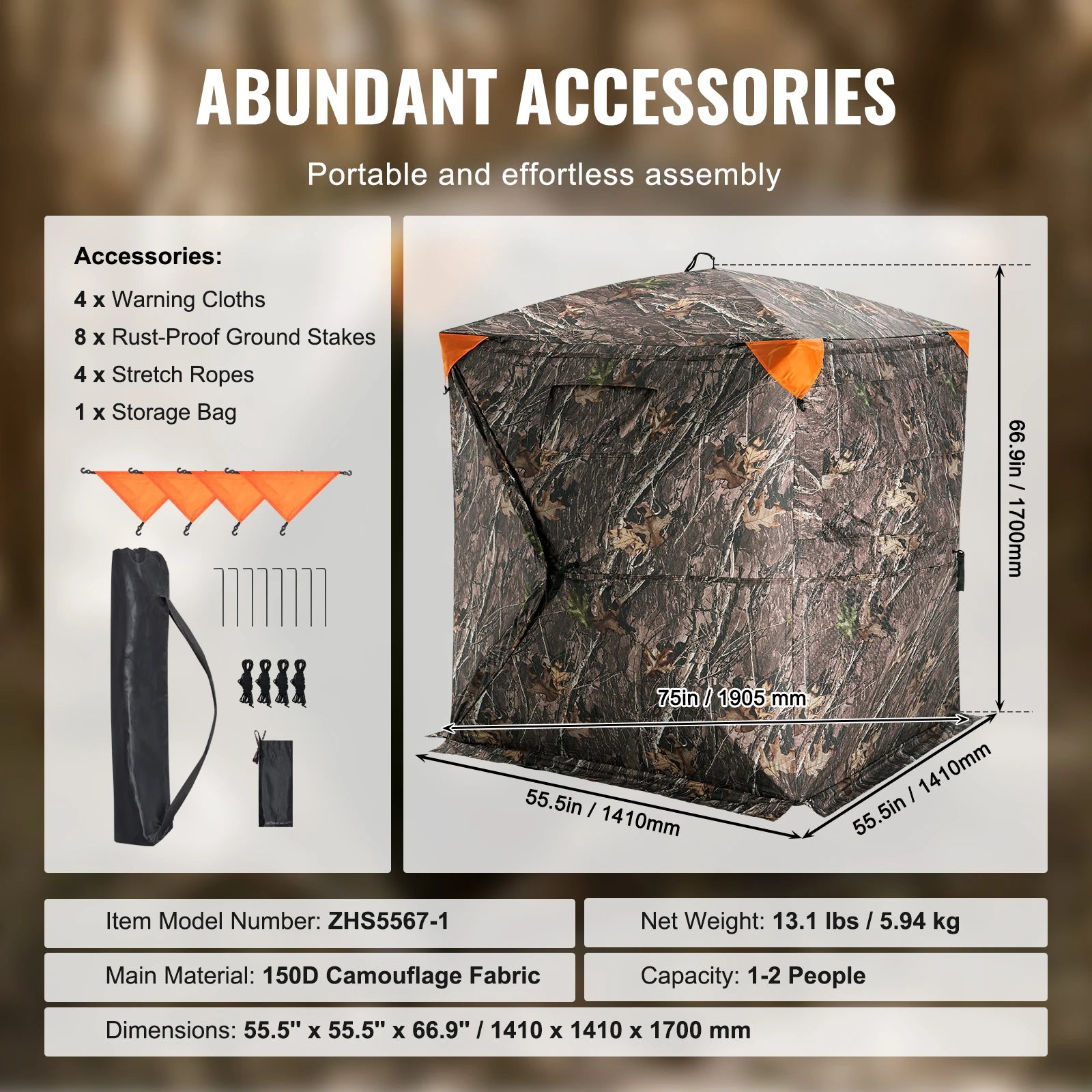 Reliable Weatherproof Construction: Crafted with waterproof camouflage fabric, sturdy metal hubs, and fiberglass poles, this blind is built to withstand rain, snow, and wind. It offers durable and reliable protection, ensuring you stay dry and sheltered in any weather.